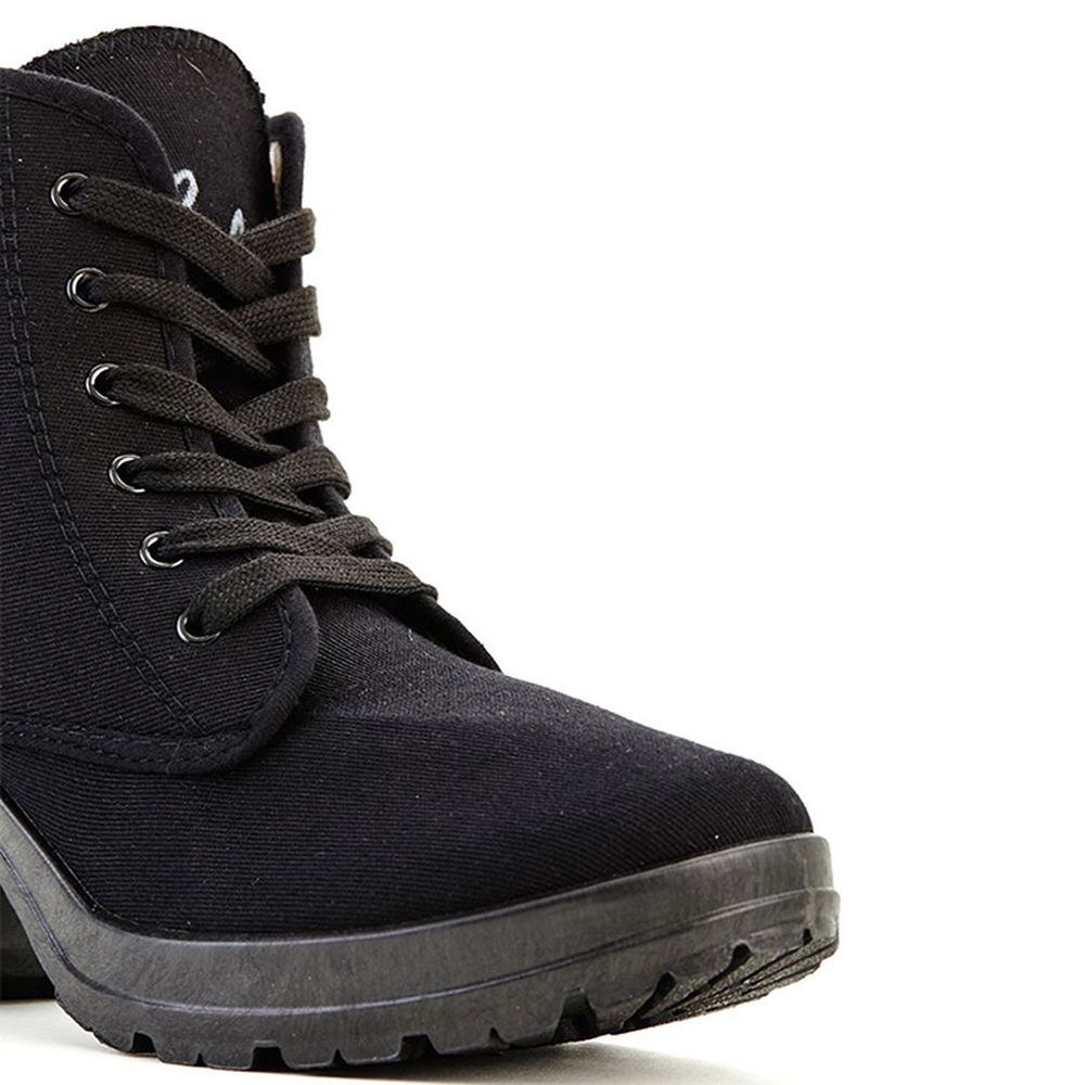 Ботильоны на шнуровке с рифленой подошвой и устойчивым 7,5 сантиметровым каблуком. Верх модели сделать из синтетического полотна, устойчивого к промоканию. Ботильоны хорошо сочетаются с платьем flare dress и ожерельем-оверсайз.