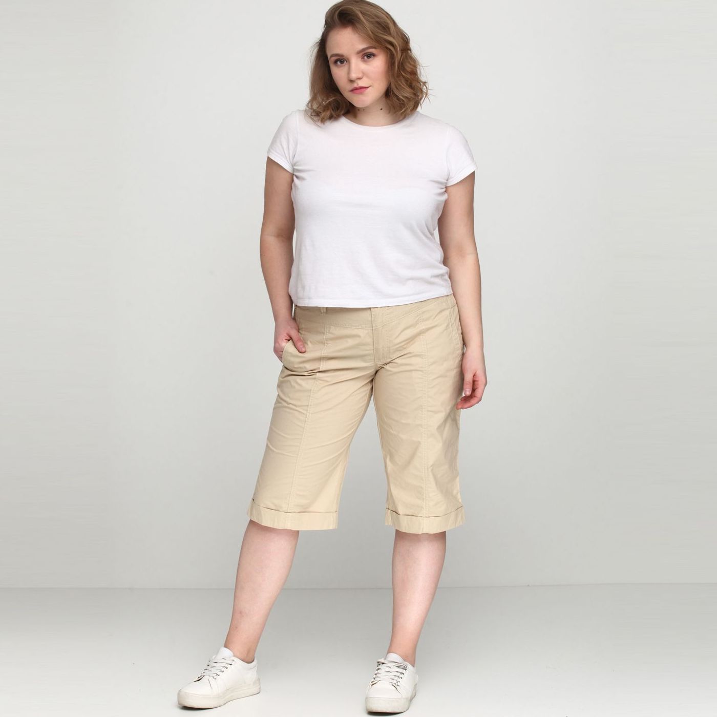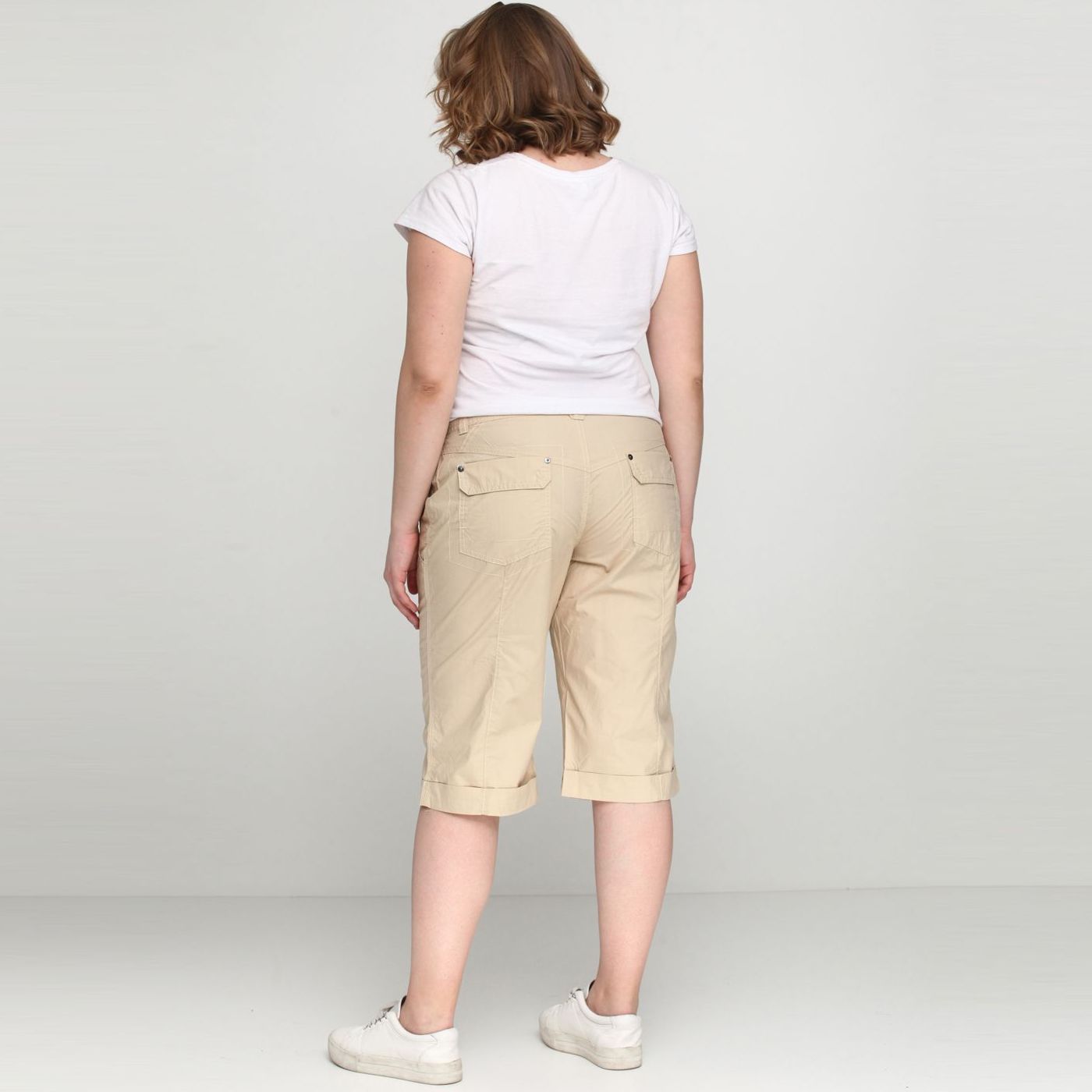 Бриджи на молнии и пуговице, с прорезными карманами. На размер 44 длина по внутреннему шву: 42 см.
