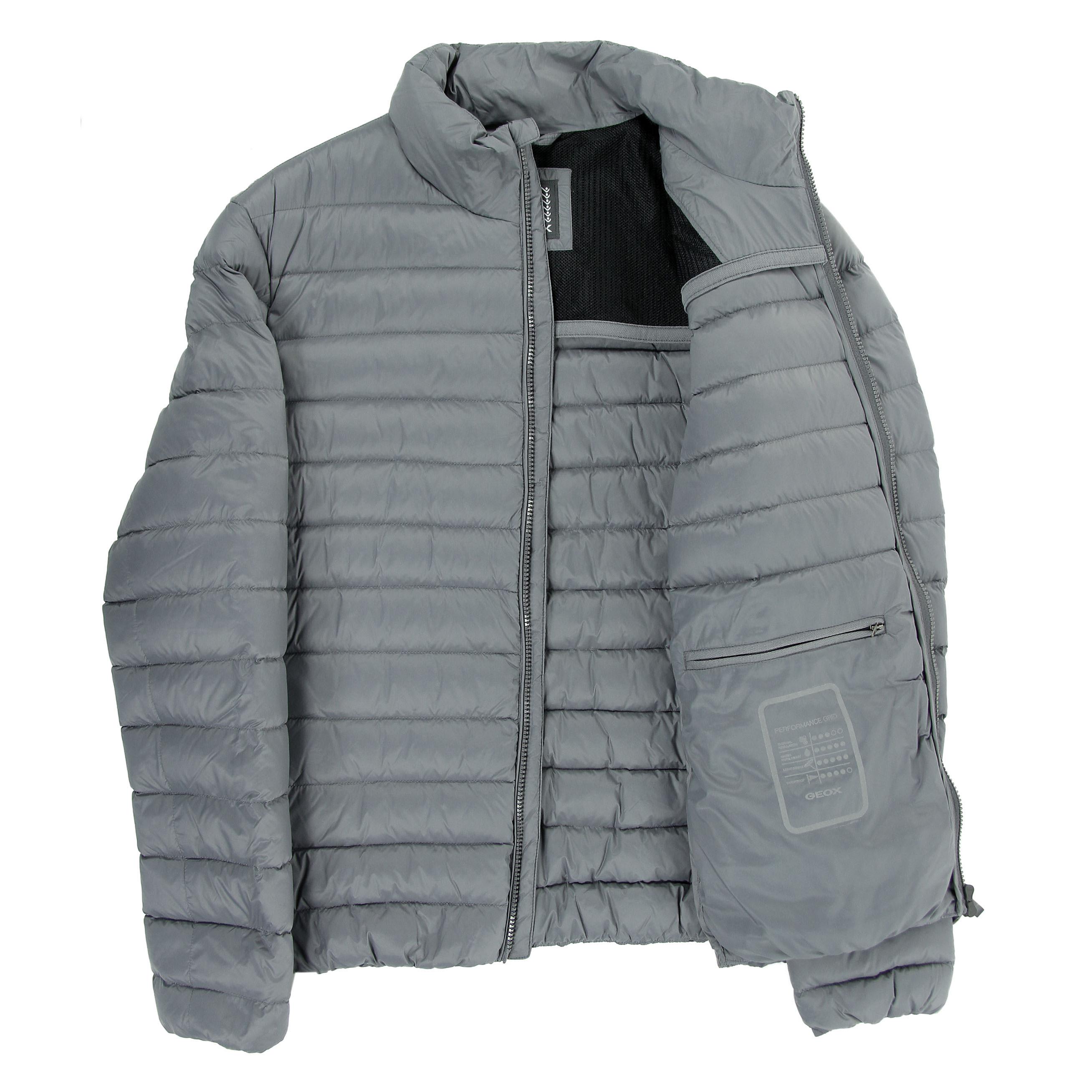 Короткая стеганая пуховая куртка. Фирменная технология Geox Respira делает куртку дышащей, с хорошей защитой от ветра и влаги.